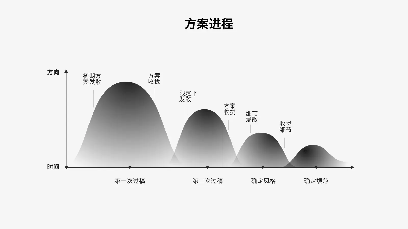 从最初的启动项目到最终的定稿普遍要经历两至三轮发散—收紧的过程。
