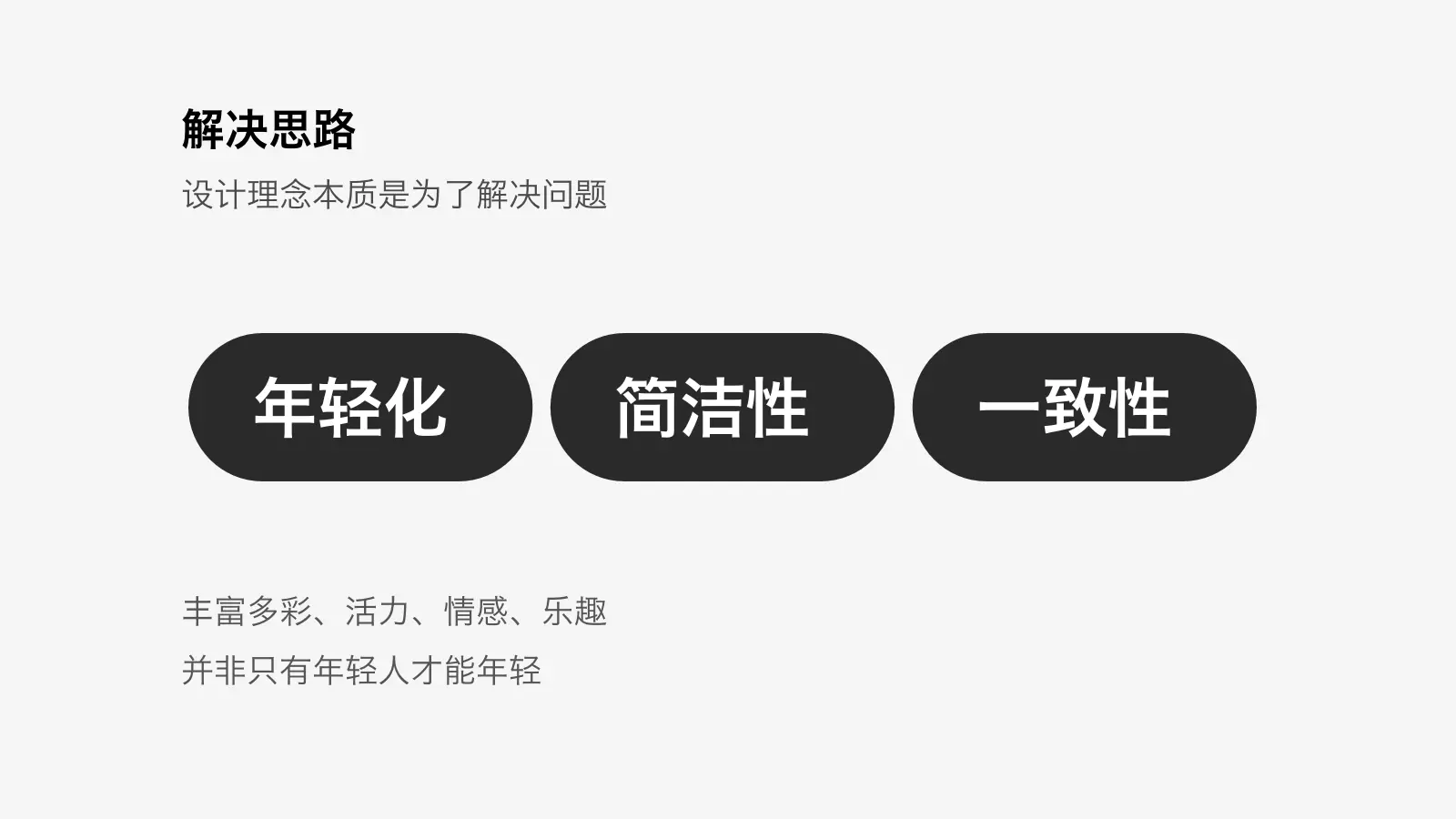 解决思路是:年轻化、简洁性、一致性。并非只有年轻人才喜欢年轻化。
