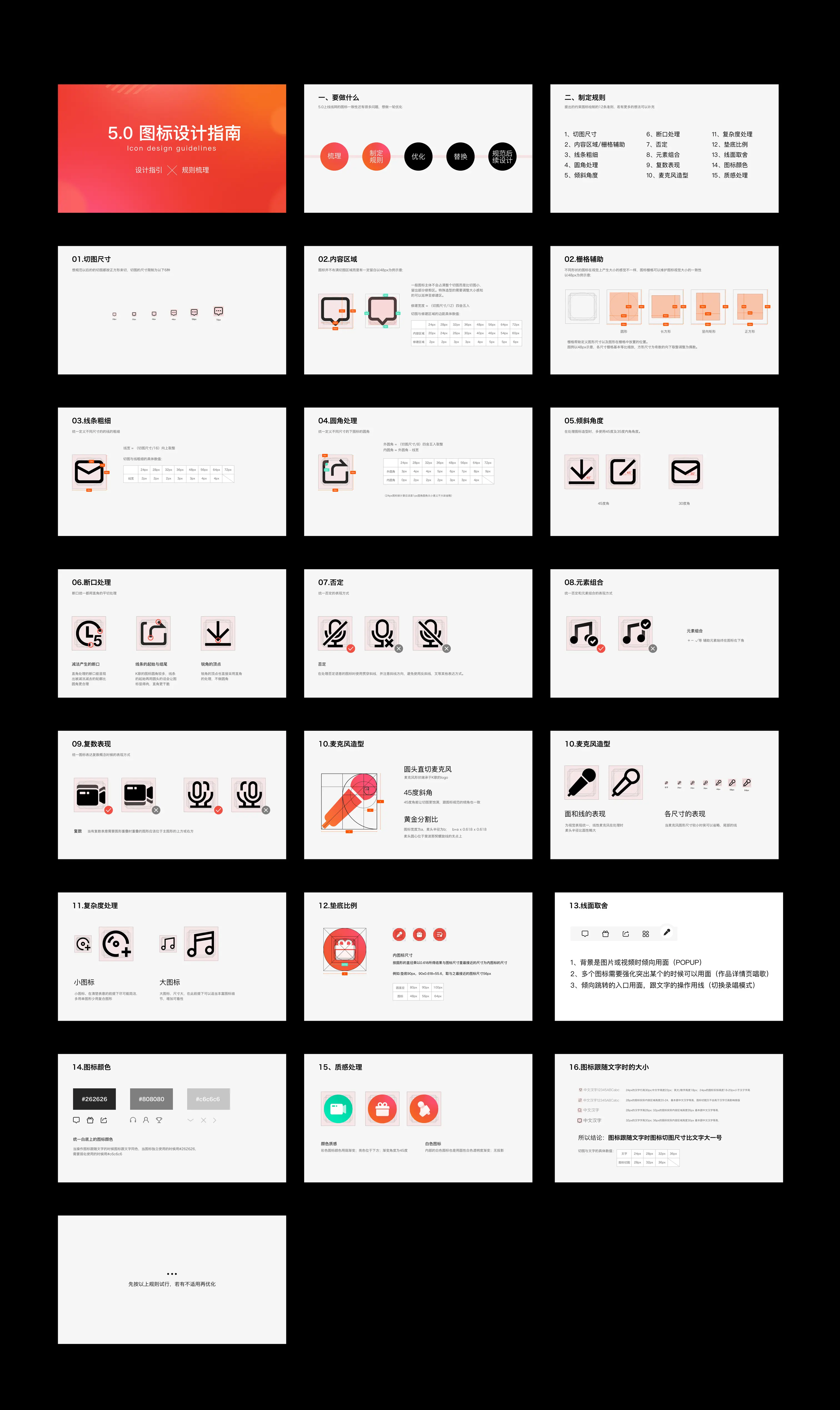 我们规范了所有图标的切图尺寸,将所有图标切图都收拢为方形的六个尺寸。这样以后维护替换图标会更加方便。并且出了一套详细的图标设计指引,来统一同一APP里的多名设计师的输出的一致性。