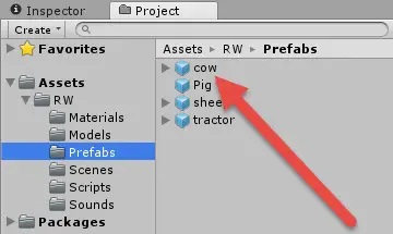 该项目已经为每只动物设置了预制件(prefabs)。 在“项目”窗口中,打开Assets ▸ RW ▸ Prefabs窗口并选择cow预制件。