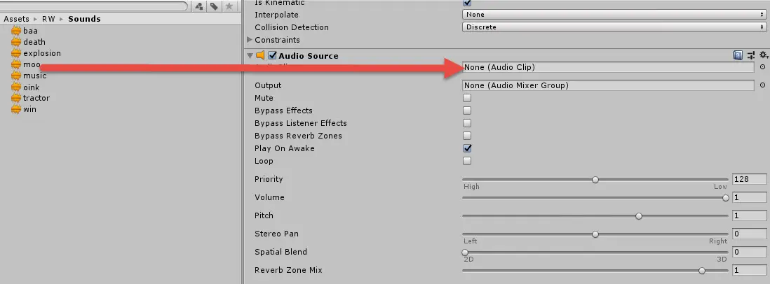 AudioClip是一个可以在AudioSource上设置的变量(即每个AudioSource都有一个AudioClip)。 您可以通过Unity编辑器和代码附加组件,但本教程仅使用编辑器。