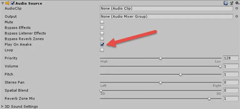 Play On Awake是否选中? 您不会总是想要这个,但是,如果您希望在创建对象后立即播放声音,请检查是否已切换。 它将在创建对象的同一帧中播放。