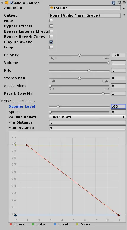 这是最接近玩家的拖拉机,因此其声音衰减应该比后两者更具戏剧性。将Volume Rolloff设置为Linear Rolloff,这将使效果更加明显。接下来,将Min Distance设置为1,将Max Distance设置为9。将Doppler Level设置为0.68。