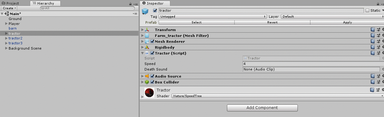 首先,您需要将死亡声音的AudioClip附加到Tractor组件。 去做这个: