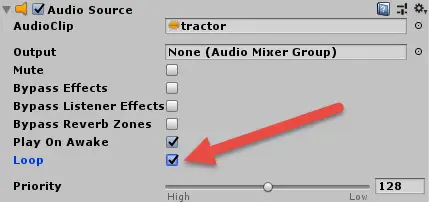 如果您玩游戏的时间超过40秒,您会发现拖拉机的声音已被切断。 那是因为他们的AudioSource还没有设置为循环。 要更改此设置,请单击每个拖拉机的AudioComponent的Loop框。