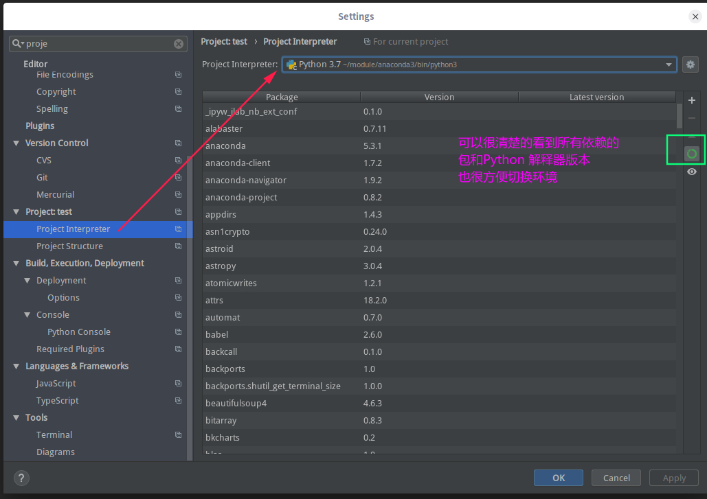 这个版本的 Anaconda 自带的Python 解释器是 3.7 版本,默认 Base 虚拟环境,并且自带了一系列包可以使用