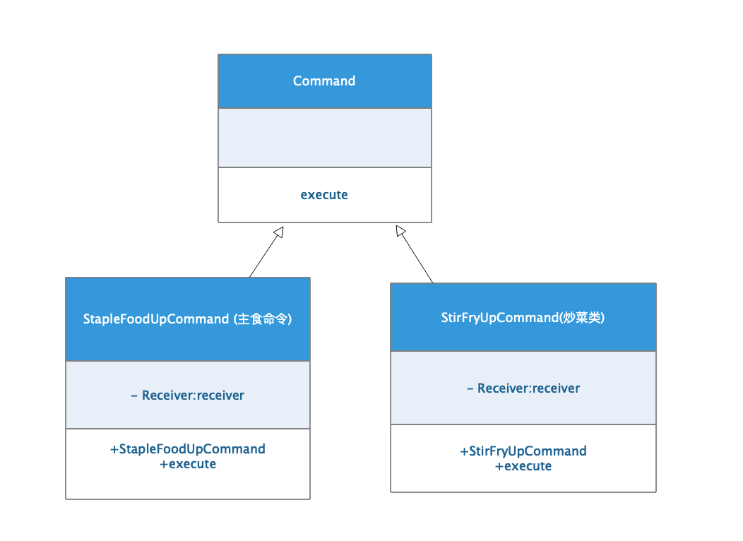 为什么要有命令类存在,直接调用实现不就可以了么.原因在于更加的灵活性,针对不同的实现,我们还可以在execute中完成不同任务的其他和具体炒菜、主食功能无关的相应操作.增强了功能实现的灵活性