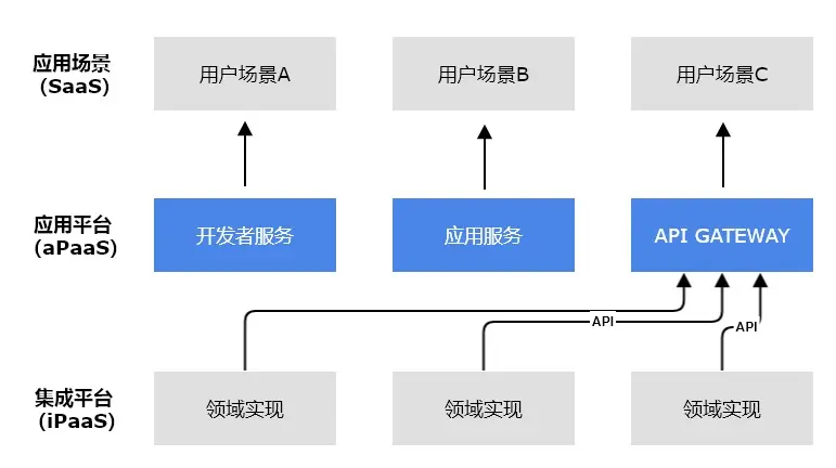 在电商领域,iPaaS 提供支付、物流、商品管理等平台服务,这些细分的领域,需要专业的人员去抽象、合规,最终仅通过 API 的形式对 SaaS 层输出领域能力。