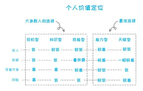 个人所选择的定位(也可以称之为增值方式)分成五种不同的类型:投机型、知识型、技能型、能力型、天赋型。需要注意的是,在识别你的价值类型时,并非看你有没有知识、能力,而是要看你的差异化因素在哪里