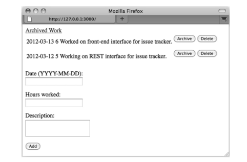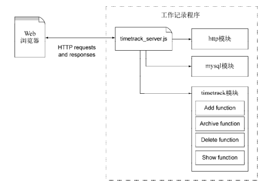 这个程序会用Node内置的http模块实现Web服务器的功能,用一个第三方模块跟MySQL服务器交互。一个名为timetrack的定制模块,它是程序特有的函数,用来在MySQL中存储、修改和获取数据。