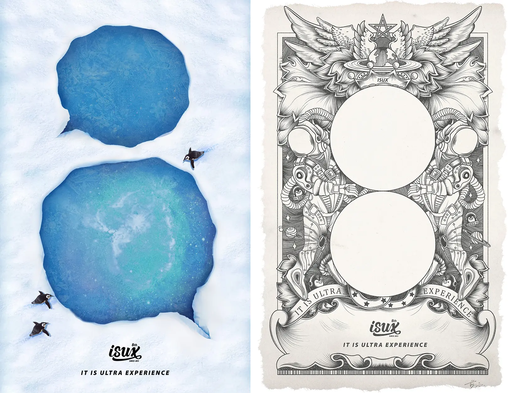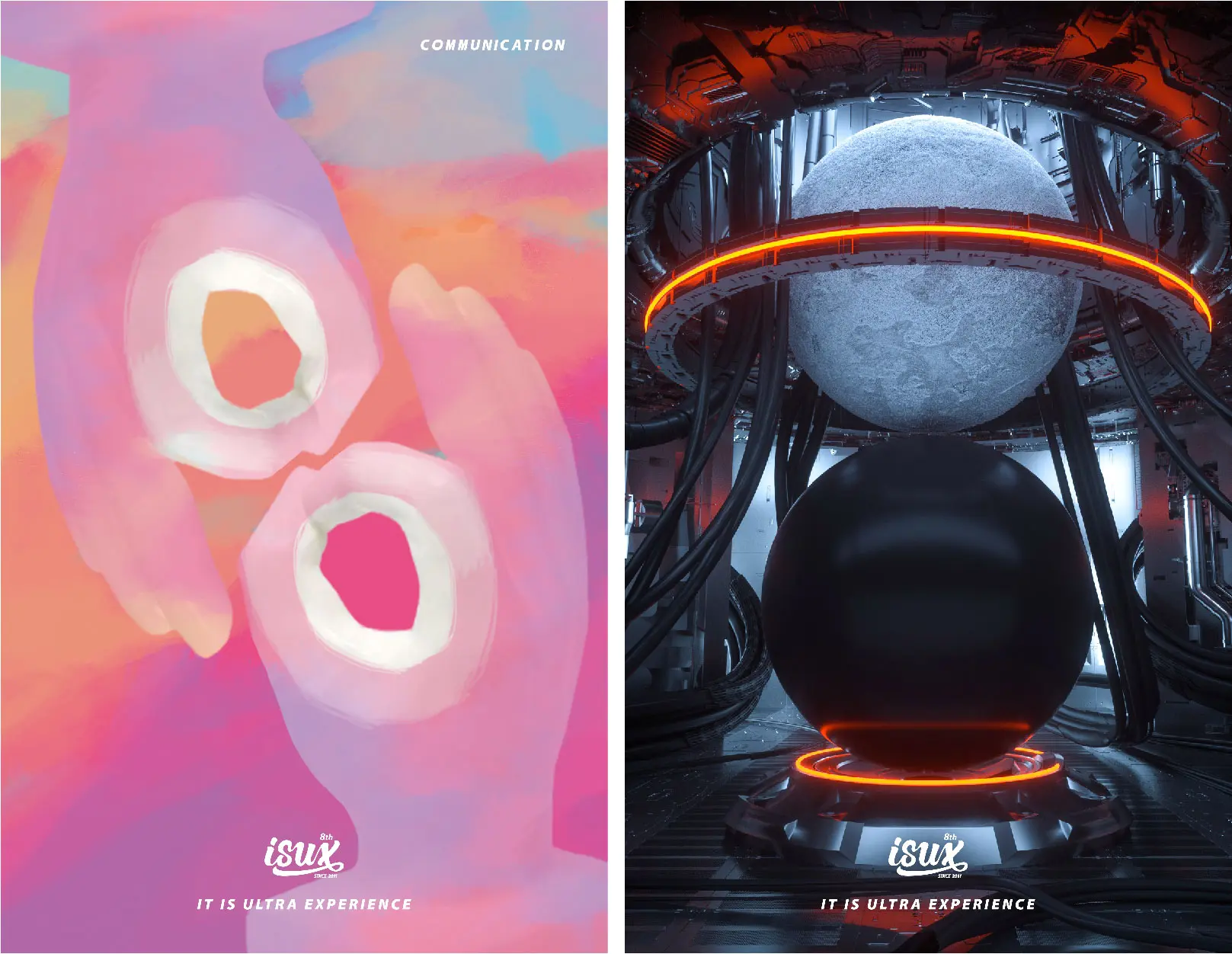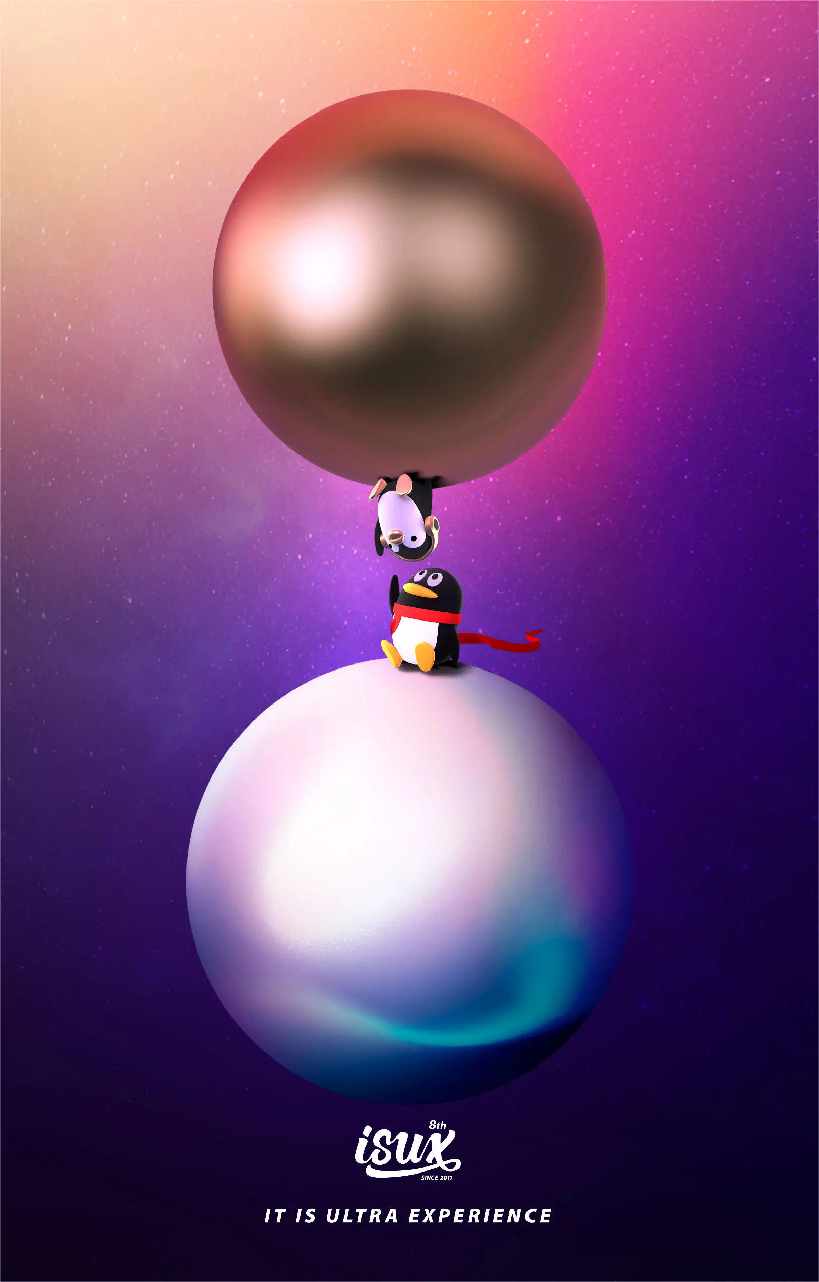 周年庆的主视觉设计,我们从slogan “It iS Ultra eXperience-这就是极致体验” 为设计的出发点,希望体现极致的概念。“极致” 可以理解为最高最佳,ISUX汇聚了设计领域顶尖的设计师力量,这里我们每天都用设计一点点完善用户的体验。在ISUX,每天灵感的交汇都能碰撞出各种创意的火花,我们创建了一个属于设计师的设计星球,通过星球的碰撞,体现设计灵感的碰撞和火花。我们还将主视觉制作成动态壁纸供设计师下载。