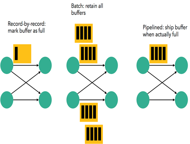 在执行引擎这一层,流处理系统与批处理系统最大不同在于节点间的数据传输方式。对于一个流处理系统,其节点间数据传输的标准模型是:当一条数据被处理完成后,序列化到缓存中,然后立刻通过网络传输到下一个节点,由下一个节点继续处理。 而对于一个批处理系统,其节点间数据传输的标准模型是:当一条数据被处理完成后,序列化到缓存中,并不会立刻通过网络传输到下一个节点,当缓存写满,就持久化到本地硬盘上,当所有数据都被处理完成后,才开始将处理后的数据通过网络传输到下一个节点。这两种数据传输模式是两个极端,对应的是流处理系统对低延迟的要求和批处理系统对高吞吐量的要求。Flink的执行引擎采用了一种十分灵活的方式,同时支持了这两种数据传输模型。Flink以固定的缓存块为单位进行网络数据传输,用户可以通过缓存块超时值指定缓存块的传输时机。如果缓存块的超时值为0,则Flink的数据传输方式类似上文所提到流处理系统的标准模型,此时系统可以获得最低的处理延迟。如果缓存块的超时值为无限大,则Flink的数据传输方式类似上文所提到批处理系统的标准模型,此时系统可以获得最高的吞吐量。同时缓存块的超时值也可以设置为0到无限大之间的任意值。缓存块的超时阈值越小,则Flink流处理执行引擎的数据处理延迟越低,但吞吐量也会降低,反之亦然。通过调整缓存块的超时阈值,用户可根据需求灵活地权衡系统延迟和吞吐量。