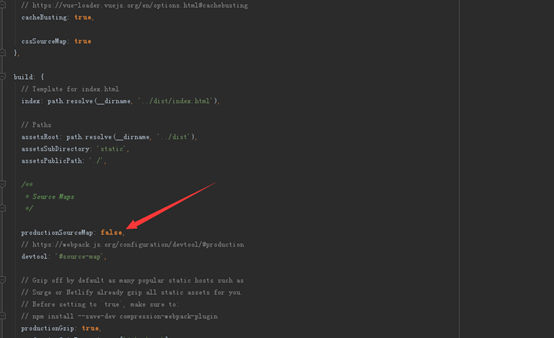 1、项目构建完成,首次打包后发现打包过程很慢,查看生成的文件中有一个map文件,其功能主要是用于测试,取消生成map文件,找到config/index.js,箭头所指的地方修改为false即可