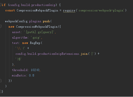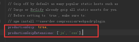3、时间久了之后,项目需求增多,导致项目体积变大,这时可以考虑开启GZIP压缩,找到config/index.js中,修改以下配置