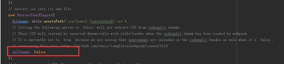 4、打包后只会生成一个app.css,如果体积过大,并且各组件多使用了scoped样式,则在build/webpack.prod.conf.js中可配置,禁止合并到打包后的app.css,找到allChunks,修改为false,如下: