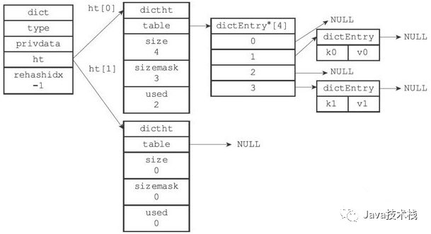typedef struct dict { // 类型特定函数 dictType *type; // 私有数据 void *privdata; // 哈希表 dictht ht[2]; // rehash 索引 // 当 rehash 不在进行时,值为 -1 int rehashidx; /* rehashing not in progress if rehashidx == -1 */ // 目前正在运行的安全迭代器的数量 int iterators; /* number of iterators currently running */} dict;typedef struct dictht { // 哈希表数组 dictEntry **table; // 哈希表大小 unsigned long size; // 哈希表大小掩码,用于计算索引值 // 总是等于 size - 1 unsigned long sizemask; // 该哈希表已有节点的数量 unsigned long used;} dictht;typedef struct dictEntry { void *key; union {void *val;uint64_t u64;int64_t s64;} v; // 指向下个哈希表节点,形成链表 struct dictEntry *next;} dictEntry;typedef struct dictType { // 计算哈希值的函数 unsigned int (*hashFunction)(const void *key); // 复制键的函数 void *(*keyDup)(void *privdata, const void *key); // 复制值的函数 void *(*valDup)(void *privdata, const void *obj); // 对比键的函数 int (*keyCompare)(void *privdata, const void *key1, const void *key2); // 销毁键的函数 void (*keyDestructor)(void *privdata, void *key); // 销毁值的函数 void (*valDestructor)(void *privdata, void *obj);} dictType;