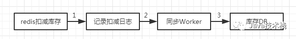 上图中,直接在Redis中扣减库存,记录日志后通过Worker同步到数据库,在设计同步Worker时需要考虑并发处理和重复处理的问题。