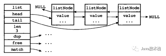 typedef struct listNode { // 前置节点 struct listNode *prev; // 后置节点 struct listNode *next; // 节点的值 void *value;} listNode;typedef struct list { // 表头节点 listNode *head; // 表尾节点 listNode *tail; // 节点值复制函数 void *(*dup)(void *ptr); // 节点值释放函数 void (*free)(void *ptr); // 节点值对比函数 int (*match)(void *ptr, void *key); // 链表所包含的节点数量 unsigned long len;} list;