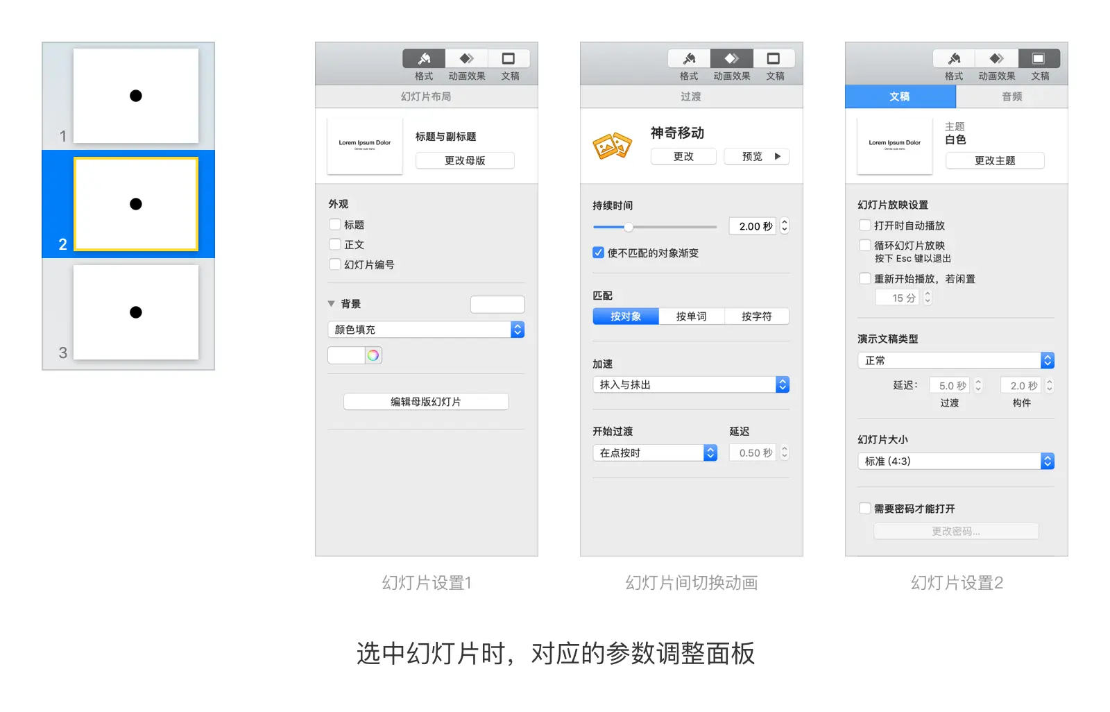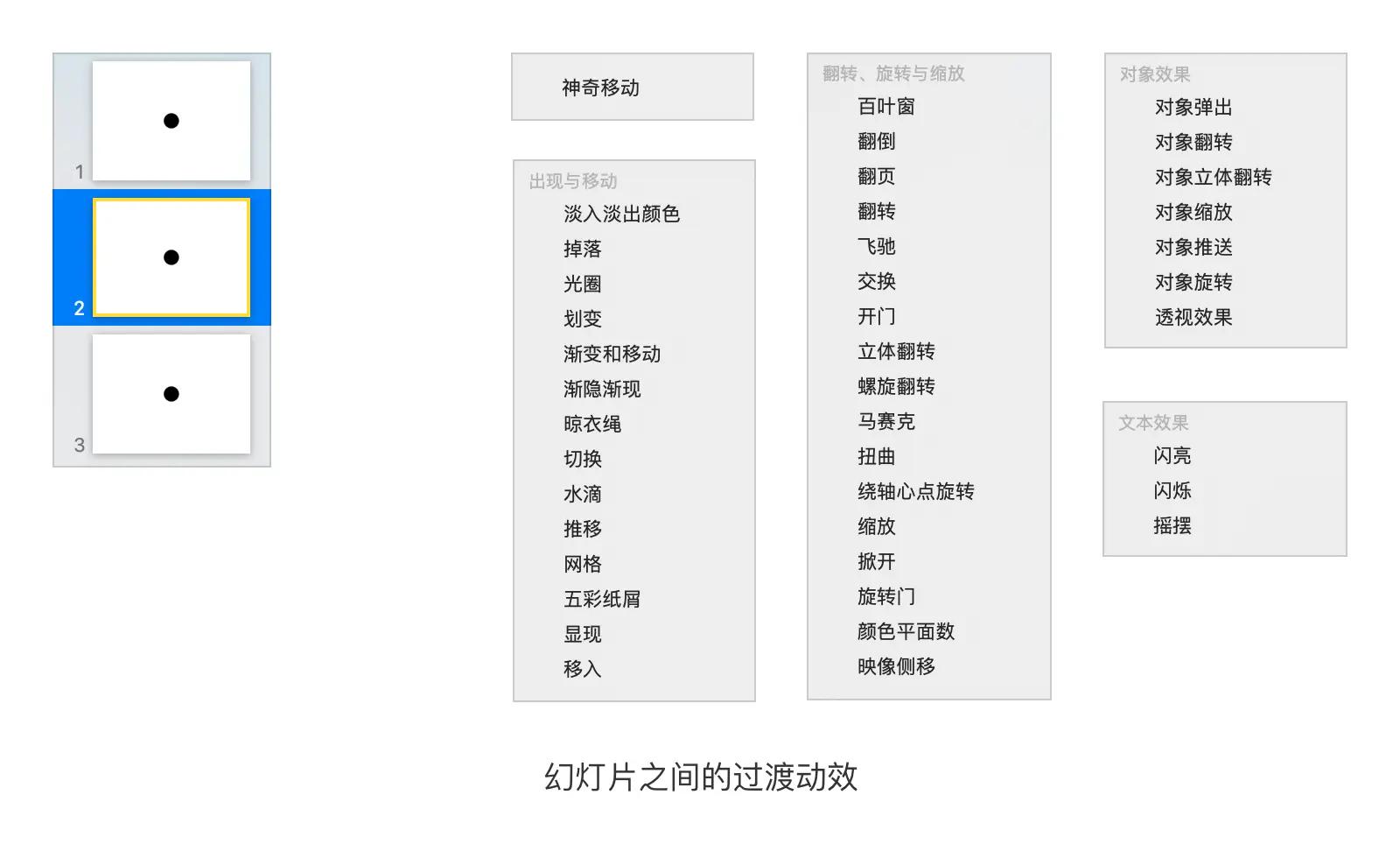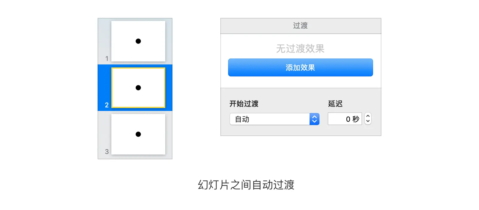 Keynote中的动效分为幻灯片之间的过渡动效和单个元素的动效。