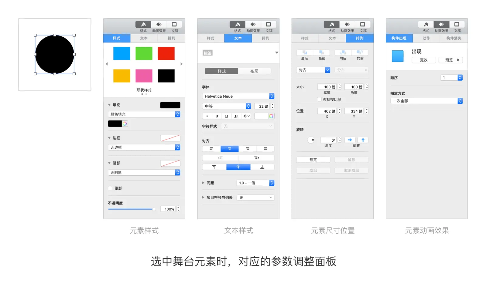 其中,右侧的参数调整又分为“格式”、“动画效果”和“文稿”三个Tab。当选中左侧导航中的幻灯片或舞台中的某个元素时,对应的参数调整面板是不同的。