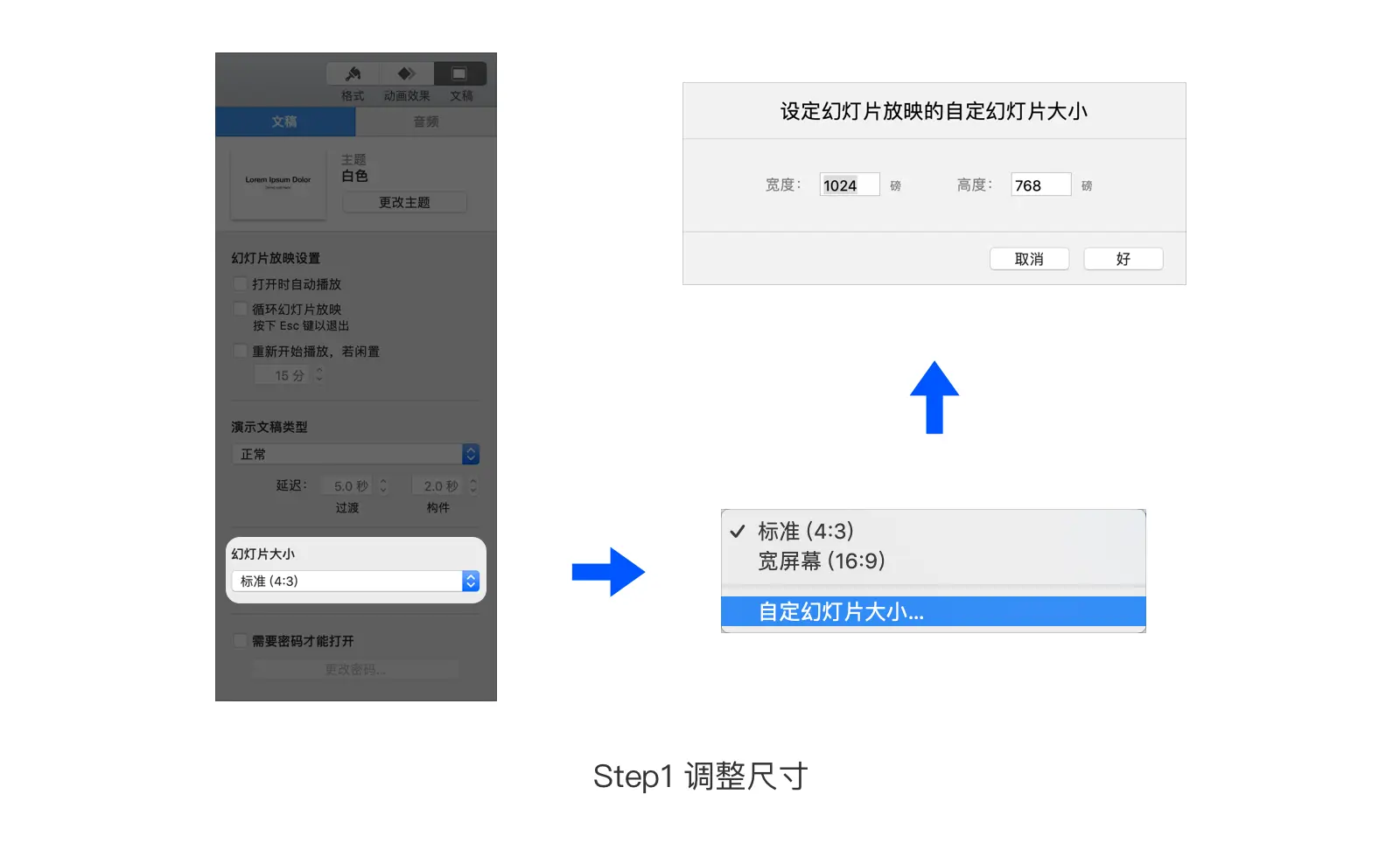 在开始动手之前,还有一些准备工作需要完成。首先就是整个幻灯片的尺寸,常见的尺寸比例有4:3和16:9,需要根据演示现场的幕布宽高比来确定选择哪一种。如果是在移动设备上演示,就根据移动设备的屏幕比例来选择,一般手机是16:9,Pad是4:3。当然,也可以自定义幻灯片的宽高尺寸。幻灯片尺寸在右侧的“文稿”Tab中调整。