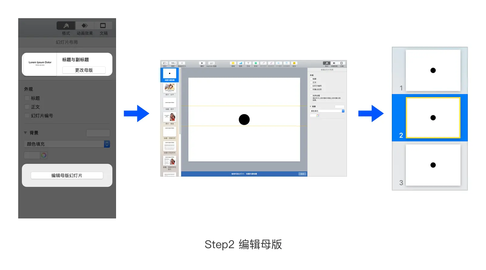 其次,编辑母版。母版有点类似于Sketch中的Symbol,改变了其中的某个元素,所有使用这个母版的幻灯片都会出现相应的改变。不同的是,母版的对象是整张幻灯片,而不是其中的某几个元素组合,也就是说,一张幻灯片只能选择一种母版。如果你的所有幻灯片都需要加上logo或者水印,使用母版就很方便了。母版的编辑以及调用在右侧的“格式”Tab中(选中幻灯片的情况下)。
