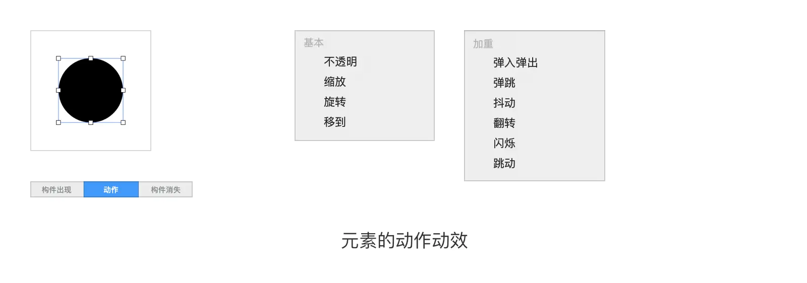 单个元素的动效又分为三个阶段:出现、动作、消失。