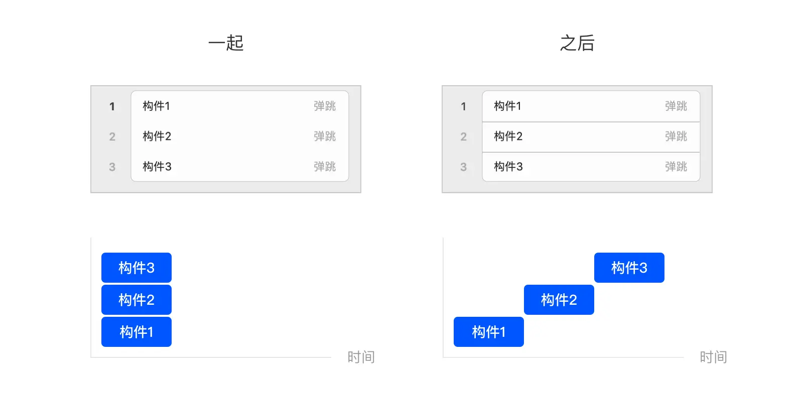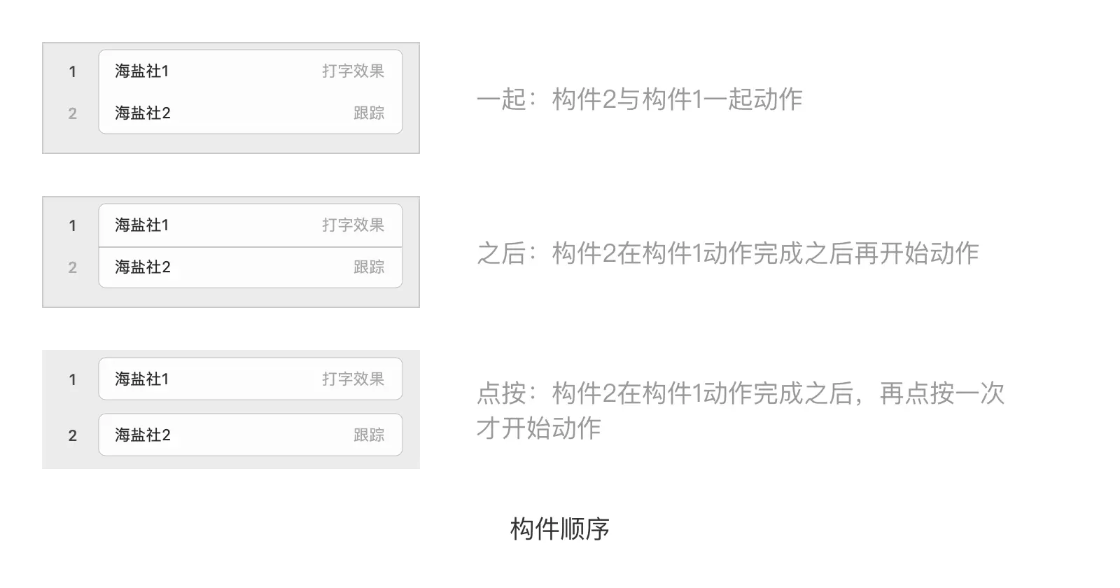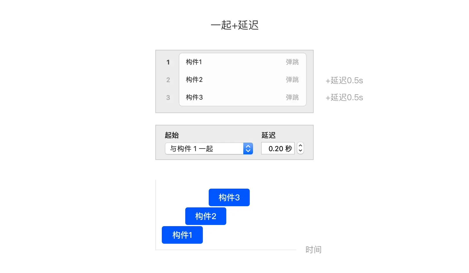 点按比较好理解,就是两个构件动作之间需要手动控制。下面重点来讲一下,“一起”与“之后”。我们通过时间轴的形式,来让大家更容易理解。