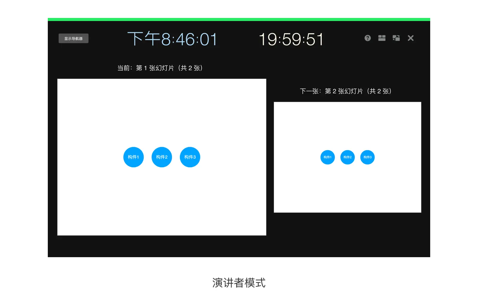 演讲者模式中,我们还可以看到当前幻灯片、下一张幻灯片以及还有多少个构件动效没有播放。在顶部,靠左的是当前时间,靠右的则是定时器,可以设置成计时器或者倒计时来帮助我们控制演讲时间。