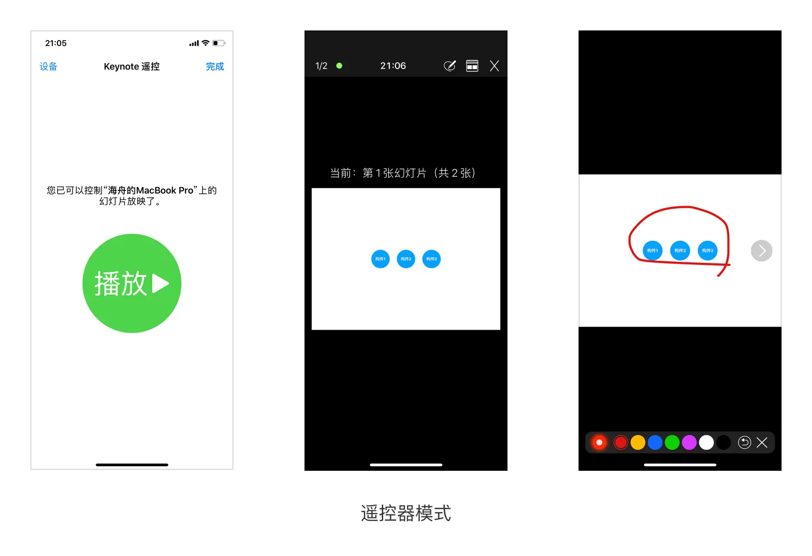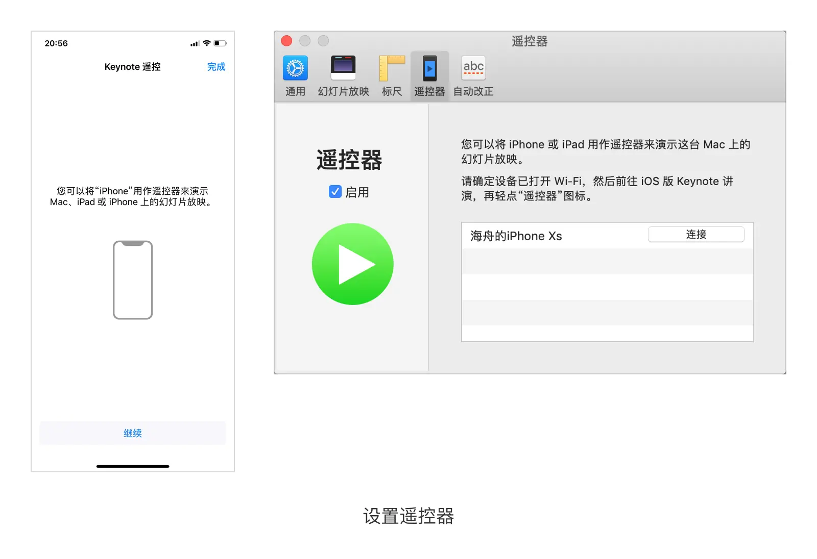 最后,如果你不在电脑边上而又不想别人帮你控制幻灯片播放时,可以利用iPhone来遥控播放。打开iPhone上的Keynote,点击右上角的遥控模式进入如下图左侧的界面,然后前往Mac端的Keynote,进入偏好设置,选择遥控器,然后连接上你的iPhone(需要在同一WiFi下),iPhone上的界面就会提示你开始播放幻灯片。