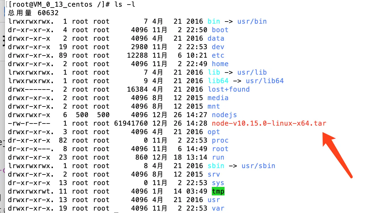 执行命令解压文件: tar -xvf node-v10.15.0-linux-x64.tar