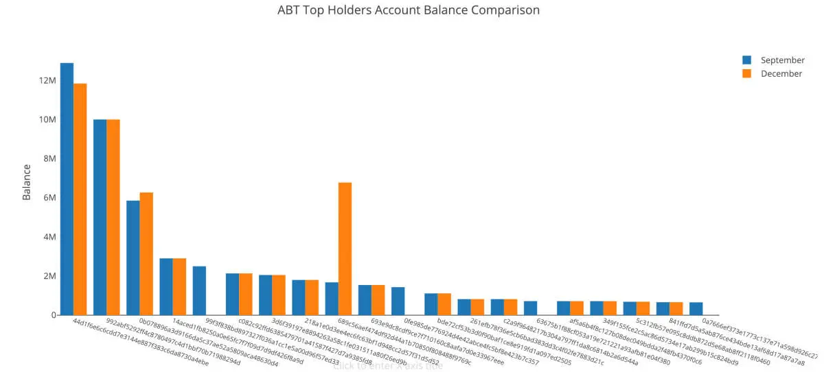 上图是 ABT 前 20 名可能的非交易所持币者账户从 9 月到 12 月 ABT 余额变化。绝大部分持币者的账户状态稳定。前三大持币者中,第1名略减持,第2名持平,第三名略增持。共计有5名持币者减持,有1名持币者大量增持(是9月的3倍左右),1名少量增持。
