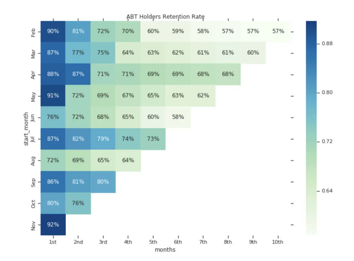 上图是ABT的持币人数保留率图。纵轴表示的是持币人从几月份开始持有ABT,横轴表示持币人持有ABT的时间长度,具体数值表示y月开始持有ABT的人,有百分之多少在x个月后仍保留ABT。如左上角第一个方格“90%”, 就表示在2月份开始持有ABT的人中,一个月后,90%的人仍然持有ABT。整体数值表明,ABT的持币状况比较稳定。即使价格略有浮动,最早的一批ABT 持币者仍有57% 还在持有ABT。
