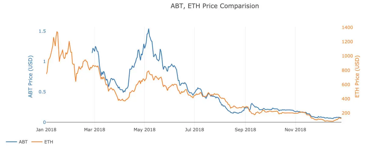 上图是 2018 年 3 月以来,ABT对标以太币的价格走势变化