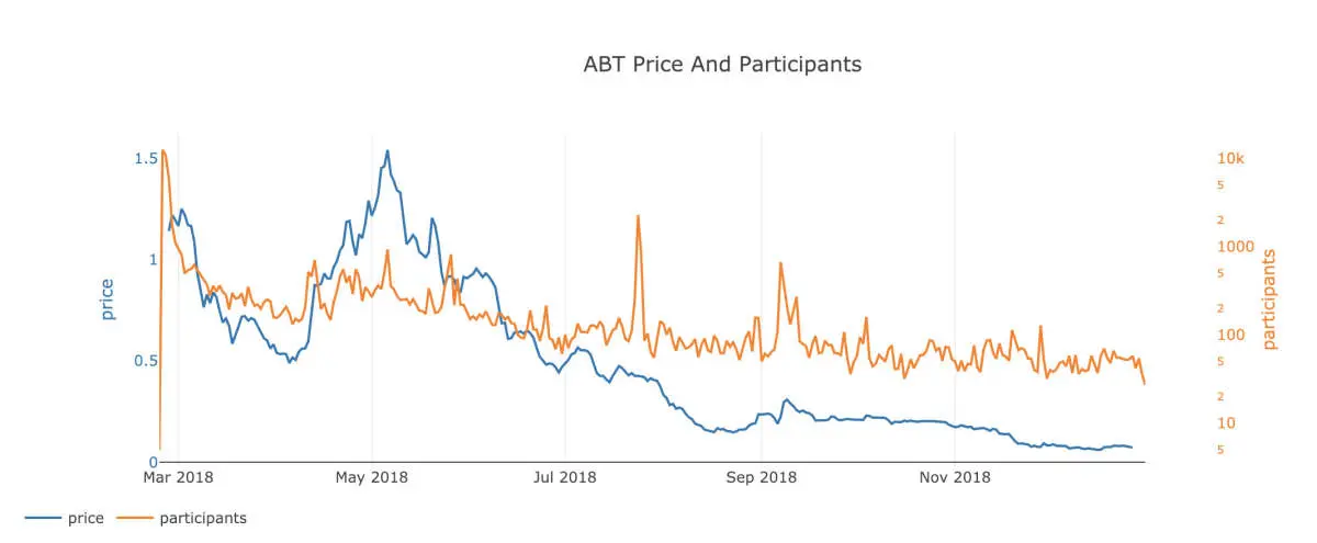 上图中,蓝色的折线是ABT自3月以来的价格走势, 橙色的是每日的交易活跃人数。从9月开始,ABT价格略有下降,12月底的时候小有回升;每日交易活跃人数也维持在一个稳定的状态。