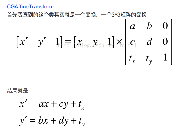 a表示x水平方向的缩放,tx表示x水平方向的偏移 d表示y垂直方向的缩放,ty表示y垂直方向的偏移 如果b和c不为零的话,那么视图肯定发生了旋转