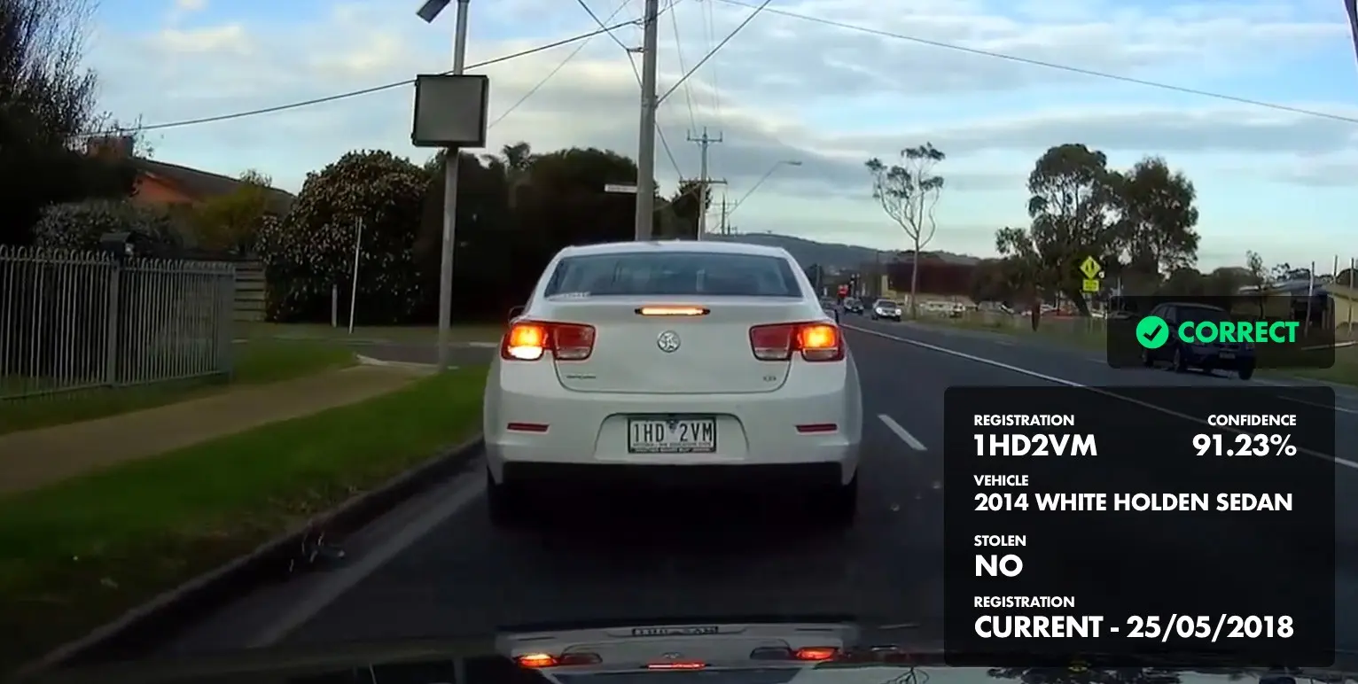 在较高的层次上,我的解决方案从dashcam视频中获取图像,通过设备本地安装的开源牌照识别系统,查询注册检查服务,然后返回结果进行显示。