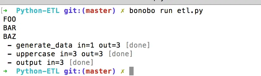 import bonobodef generate_data(): yield 'foo' yield 'bar' yield 'baz'def uppercase(x: str): return x.upper()def output(x: str): print(x)graph = bonobo.Graph( generate_data, uppercase, output,)if __name__ == '__main__': bonobo.run(graph)It is not doing something amazing, all it is doing is converting the input data into upper case and then printing it. The visualizing part is left, for that bonobo provides a way to use graphviz library for graphs. Once installed you will execute following two commands: the first one to generate dot file and the next one to generate graph image file from dot file.
