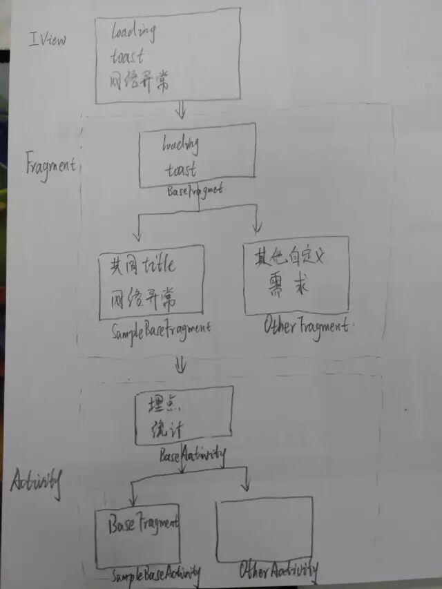 先定义一个接口,封装基本的界面操作方法(loading、toast、显示错误信息等),然后用一个 BaseFragment 来实现该接口方法,再用一个 Activity 来承载这个实现了 BaseFragment 的具体业务的 Fragment,传递的参数中告诉 Activity 需要加载的 Fragment 名字,通过这样,只需要注册一个承载 Acitivty 就可以实现显示不同的用户界面。如下图: