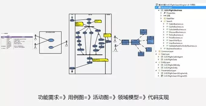 上一环是功能需求,下一环是代码实施,这是架构设计的价值所在。从功能需求到用例,到用例活动图,到领域图、架构分层,到核心代码,它们之间环环相扣。做不好领域图可能源自没有做好用例活动图,因为用例活动图是领域图的上一环。关注职责、边界、应用关系、存储、部署是架构设计的核心,下图是具体案例参考: