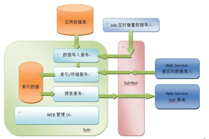 显然传统的数据库没有很好的解决办法,这时可以借助专业的检索工具。全文检索工具Solr不仅简单易用性能好,而且支持海量数据高并发,只需实现系统两边数据的准实时或定时同步即可。下图是Solr的工作原理: