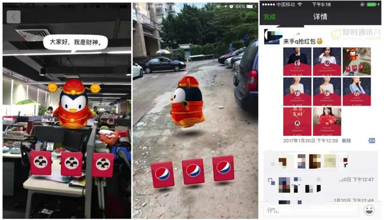 自 2015 年春节以来,QQ 春节红包经历了企业红包(2015 年)、刷一刷红包(2016 年)和 AR 红包(2017 年)几个阶段,通过不断创新玩法,活跃度节节攀升,成为春节一大玩点,给火红的春节带来一抹亮色。2017 年除夕,AR 红包、刷一刷红包再创新高,抢红包用户数达 3.42 亿,共刷出红包 37.77 亿个。