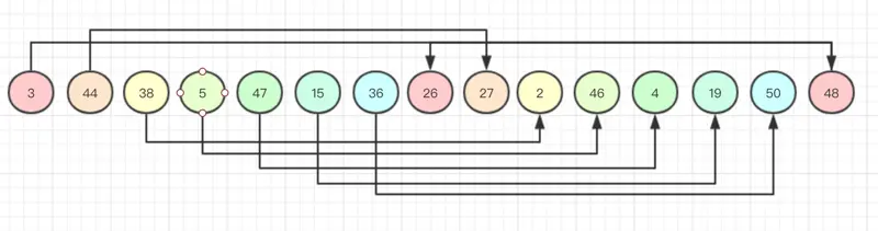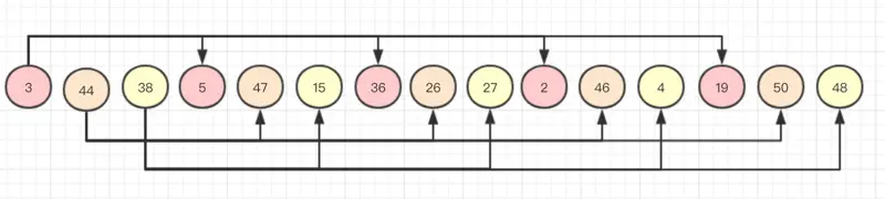 如图所示,一共15个元素,增量就是15/2为7,第一轮的分组即为[2, 26, 48],[44, 26],[38, 2],[5, 46],[47, 4],[15, 19],[36, 50],然后进行插入排序,得到新的序列[ 3, 27, 2, 5, 4, 15, 36, 26, 44, 38, 46, 47, 19, 50, 48 ],然后在进行分组,增量为7/2为3: