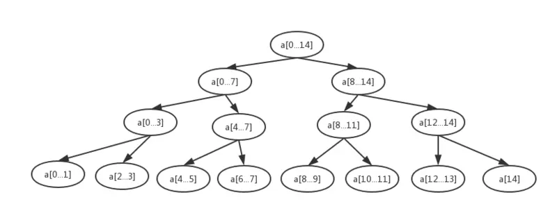 向来看第一种,自顶向下的归并排序的实现思路是不断二分,然后对二分后的最小序列分别进行排序后,再将排序后的结果向上合并得到最终的有序数组,让我们先通过一个树结构来理解归并排序的过程:
