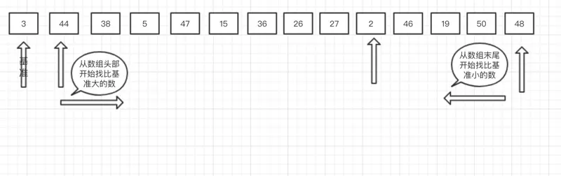 将数组的第一个元素做为基准,从数组末尾开始找比基准小的数,找到就停下来,记下索引j,然后从基准右边开始找比基准大的数找到停下来,记下索引i,然后交换i和j上的元素,得到数组: