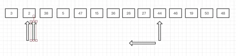 然后继续从44的位置开始找比基准3小的一直移动到2,此时索引i和索引j相等,将基准3和i、j对应的值交换位置得到: