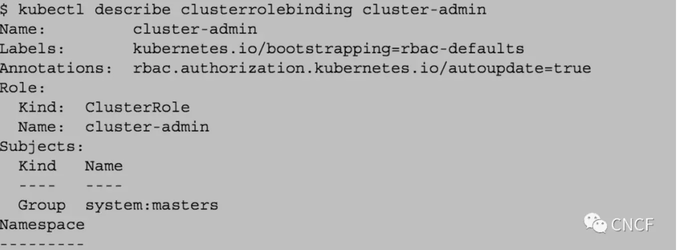 你可以使用`kubectl get clusterrolebinding`或`kubectl get rolebinding -all-namespaces`来探索集群角色和角色。 快速检查谁被授予特殊的“cluster-admin”角色,在这个例子中,它只是“masters”群: