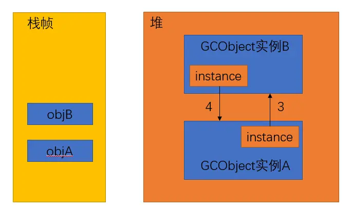 到此,GCObject 的实例 A 和 实例 B 的引用计数都不为 0, 此时如果执行垃圾回收,实例 A 和实例 B 是不会被回收的,也就出现内存泄漏了。