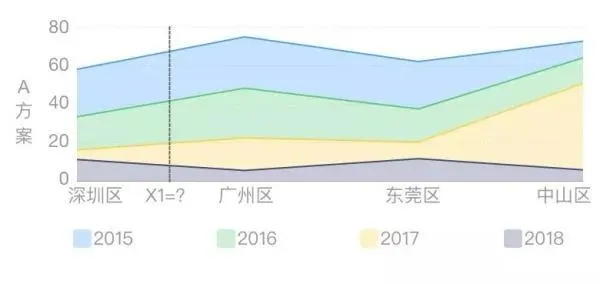 是不是觉得都可以?那图中 X1 有何含义?堆叠面积图 A 方案和堆叠柱状图 B 方案都可以表现累加值。差别在于,堆叠面积图的 x 轴是连续数据(如时间),堆叠柱状图的 x 轴是分类数据。此案例中的 x 轴是非连续的分类数据,因此用 B 方案更适合。