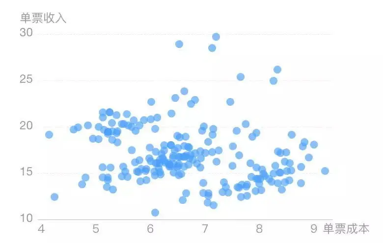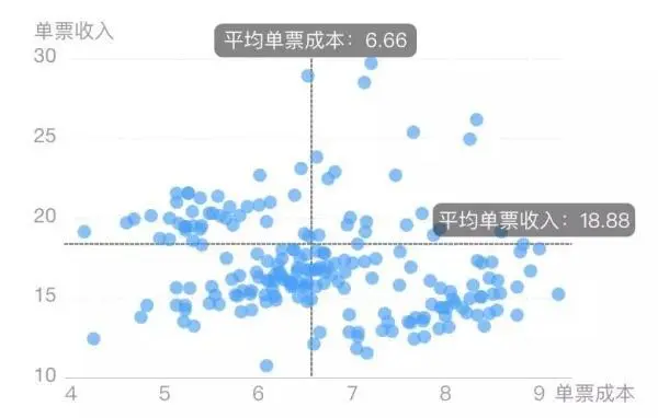 通过此图,可以看出哪些大区单票利润较低,急需提升,比如广泛聚集于右下角的第四大区,单票收入低于平均线,单票成本却高于平均线。